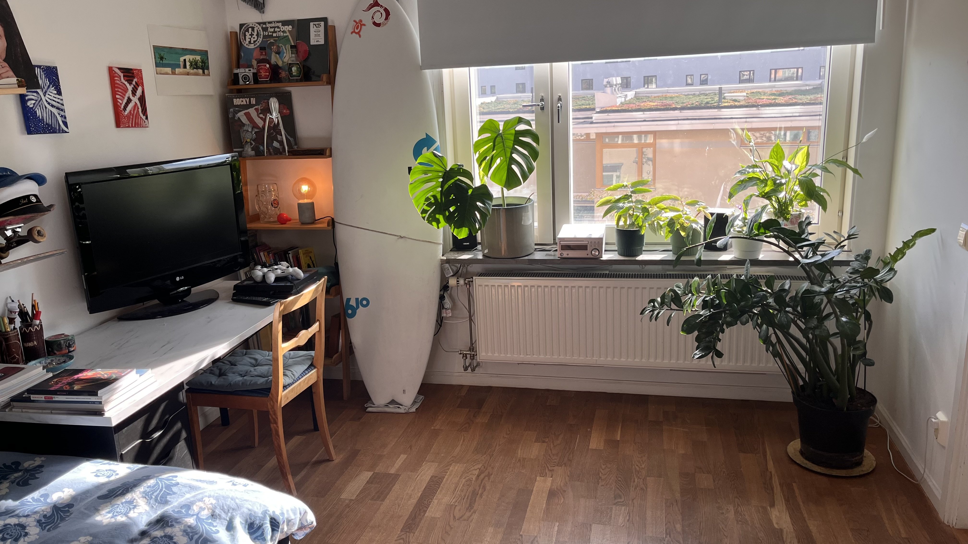 Your bedroom is a 14 square meter room next to the entrance and close to one of the two bathrooms in the apartment. It has a comfortable three quarter (120 cm) bed, a desk, a drawer, and a wardrobe. It also has a TV-set and a connected PS4. You will share the kitchen, the living room, the balcony, and the bathrooms with me and my husband, and maybe one of our adult kids. The apartment is strictly smoke-free, also on the balcony, and pet-free.