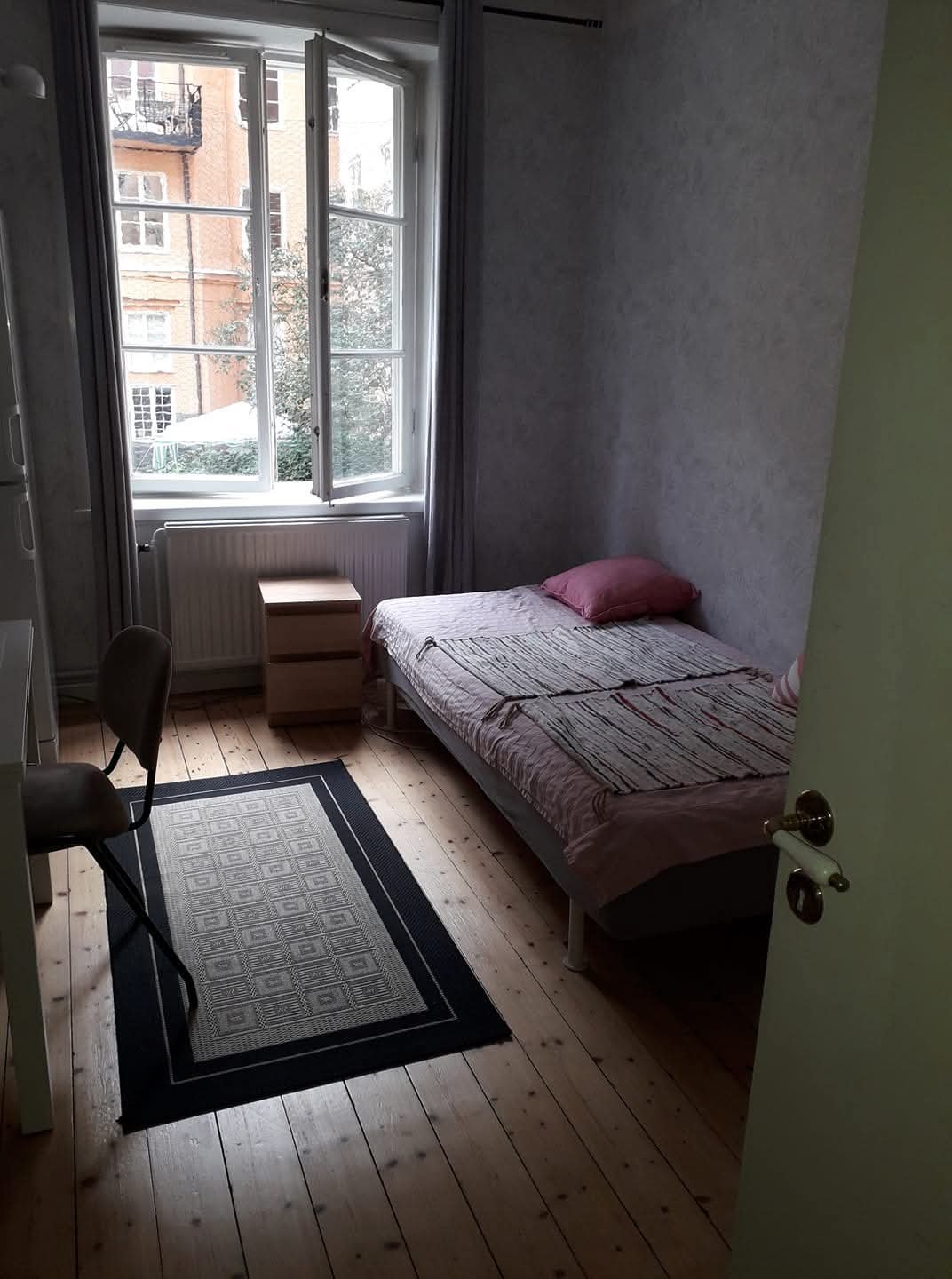 1 rum i delad 4a Fridhemsplan. Rymligt och flexibelt. Rummet ligger mot solig tyst gård. Egen toa men vi delar badrum och kök. Finns säng, egen kyl/frys, matbord, stol, två garderober. Närhet till kollektivtrafik, strandpromenader och matbutiker. Ingår bredband samt el. Finns ingen Tv. Viktigt är att du har heltidsjobb eller pluggar heltid. Inte jobbar hemifrån. Rök och drogfri samt renlig Jag värdesätter avslappnad stil även om vi inte kommer trängas. Jag har vuxna barn som hälsar på ibland Rumsren katt kan hänga med, däremot inte hund. Bilderna är från när fd hyresgäst flyttat in eller ut. Ganska spartanskt men man kan piffa till det som man vill så länge man inte målar om eller river väggar