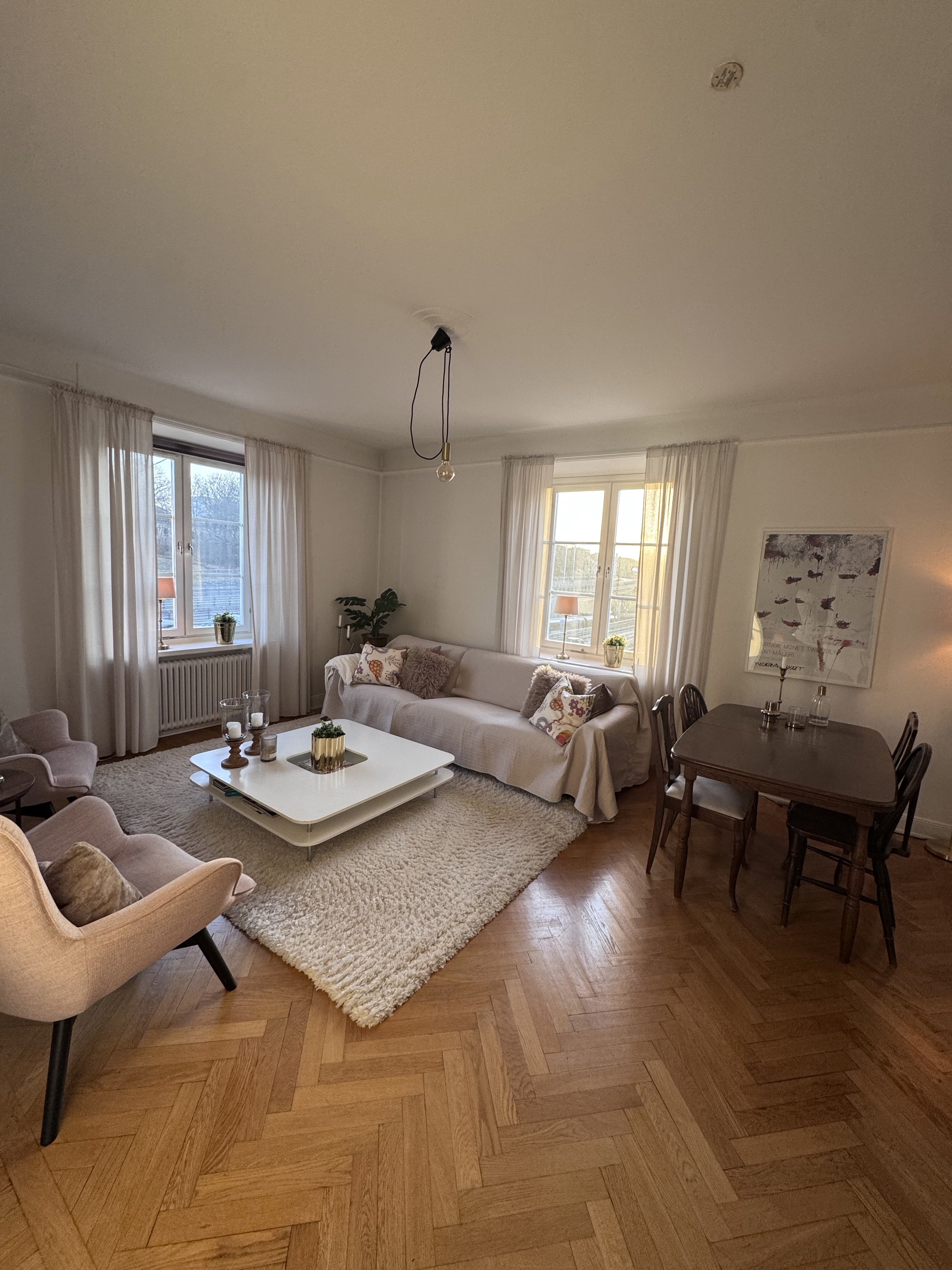 Fastighet m byggår ca 1920, 3,5 rum om 104 kvm Nära till Thorildsplans tunnelbana. Uthyres ett år för att jag ska prova att bo ihop med min pojkvän. En ljus och härlig lägenhet med stora fönster med djupa nischer, sol från morgon till kväll, takhöjd på 270 cm och parkettgolv. Tre stora rum med utsikt över Rålambshovsparken samt mot Thorildsplan gymnasium. Välkomnande entré som leder in till en möblerbar hall med öppen spis, i dagsläget med eldningsförbud. Serveringsgång med originaldetaljer bevarade, kök med plats för bord m 4 stolar i en söt alkov. Gasspis, kök från 50-tal? 3 stora skafferier, nytt kyl-och frys samt diskmaskin. Öppna spisen har tyvärr eldningsförbud nu men vi har ljus som brinner vackert så den smyckar lägenheten. Värden måste renovera den och vi har inte fått någon tidplan. I hyran ingår gas, el och wi-fi